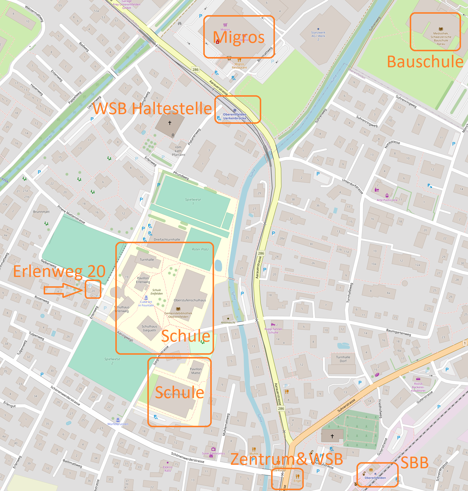 Ideal location: directly next to the school in a quiet area, 3 minutes walking distance to the tram stop Uerkenbrücke, 8 minutes walking distance to the train station SBB or to shopping center Migros. With WSB, bicycle or car in about 10 minutes in Aarau. Information about Oberentfelden