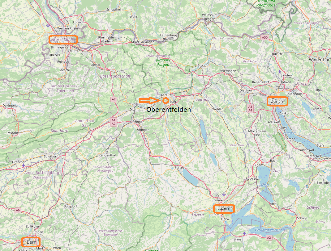 Oberentfelden liegt im Kanton Aargau, im Aargauer Mittelland, gut erreichbar von Basel, Zürich, Bern oder Luzern. Oberentfelden hat 8973* Einwohner und die nächste Stadt ist Aarau mit 22'679* Einwohnern, nur ca. 10 Minuten entfernt - egal ob mit Auto, Tram oder Velo.
